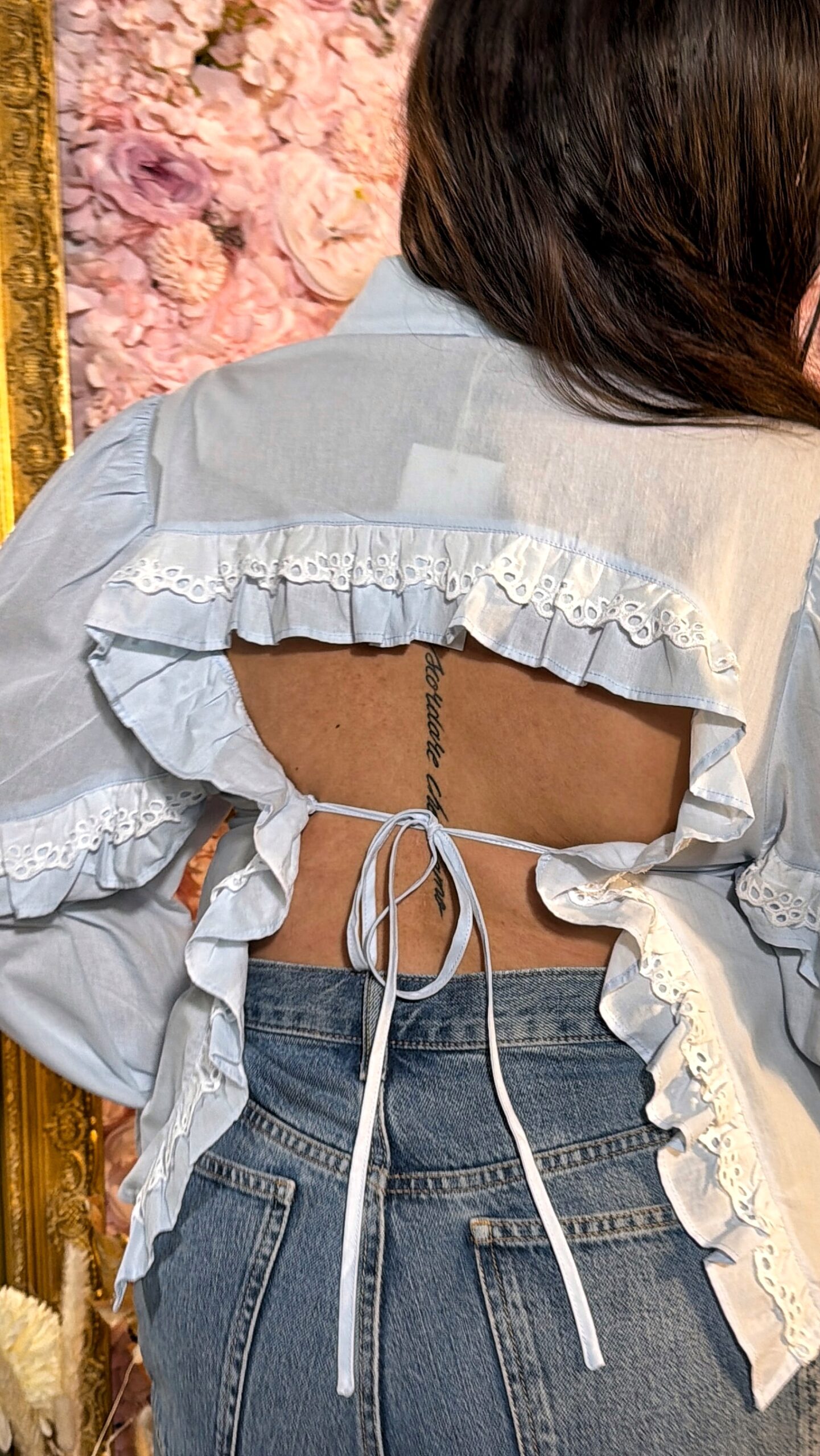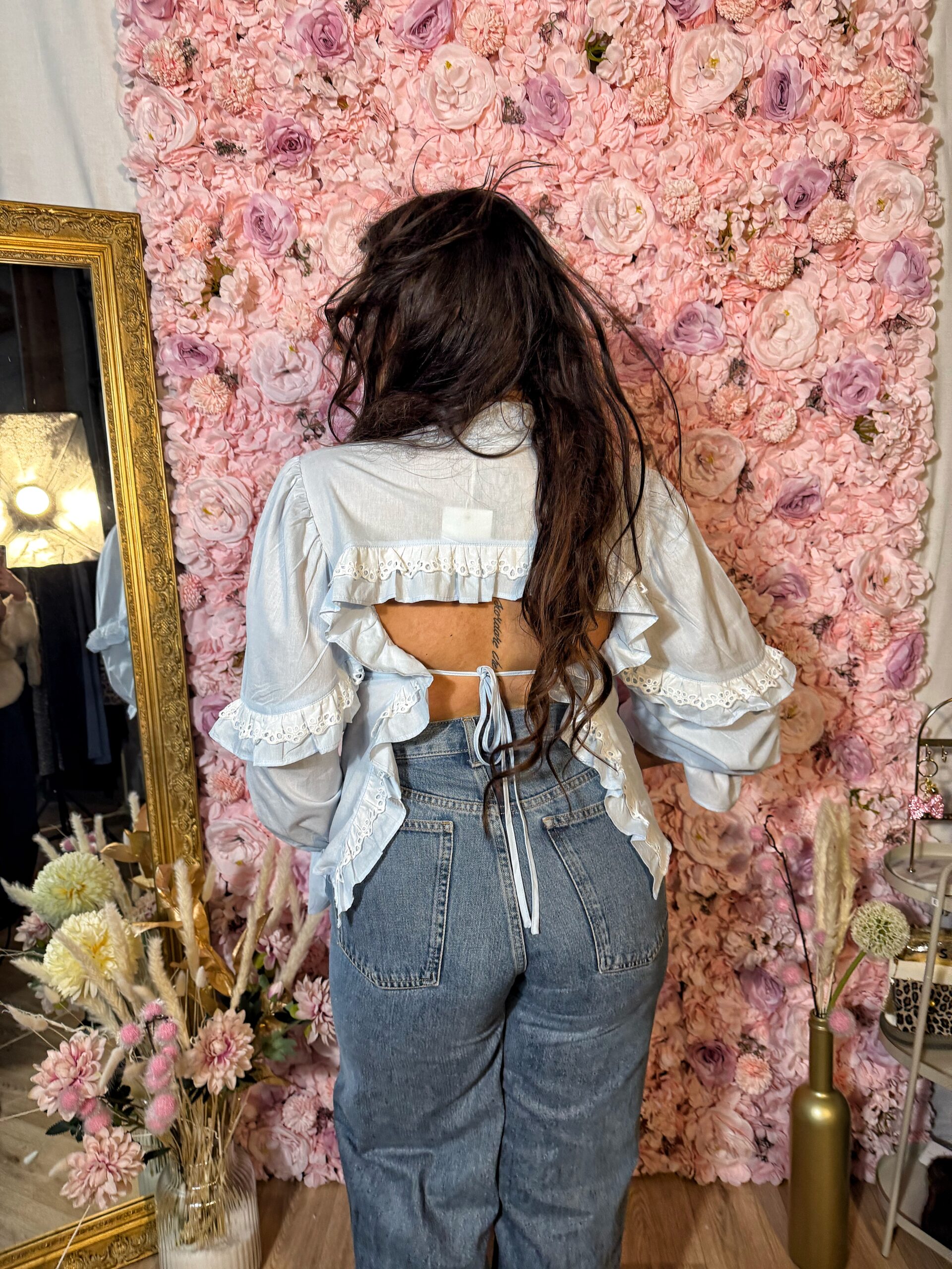 Son jeu de volants structurés et ses empiècements en dentelle contrastée soulignent la silhouette avec élégance, tandis que la coupe ajustable au dos avec lien à nouer permet un tombé personnalisé et féminin. Les manches longues légèrement bouffantes, terminées par des poignets volantés, ajoutent une note raffinée et tendance.