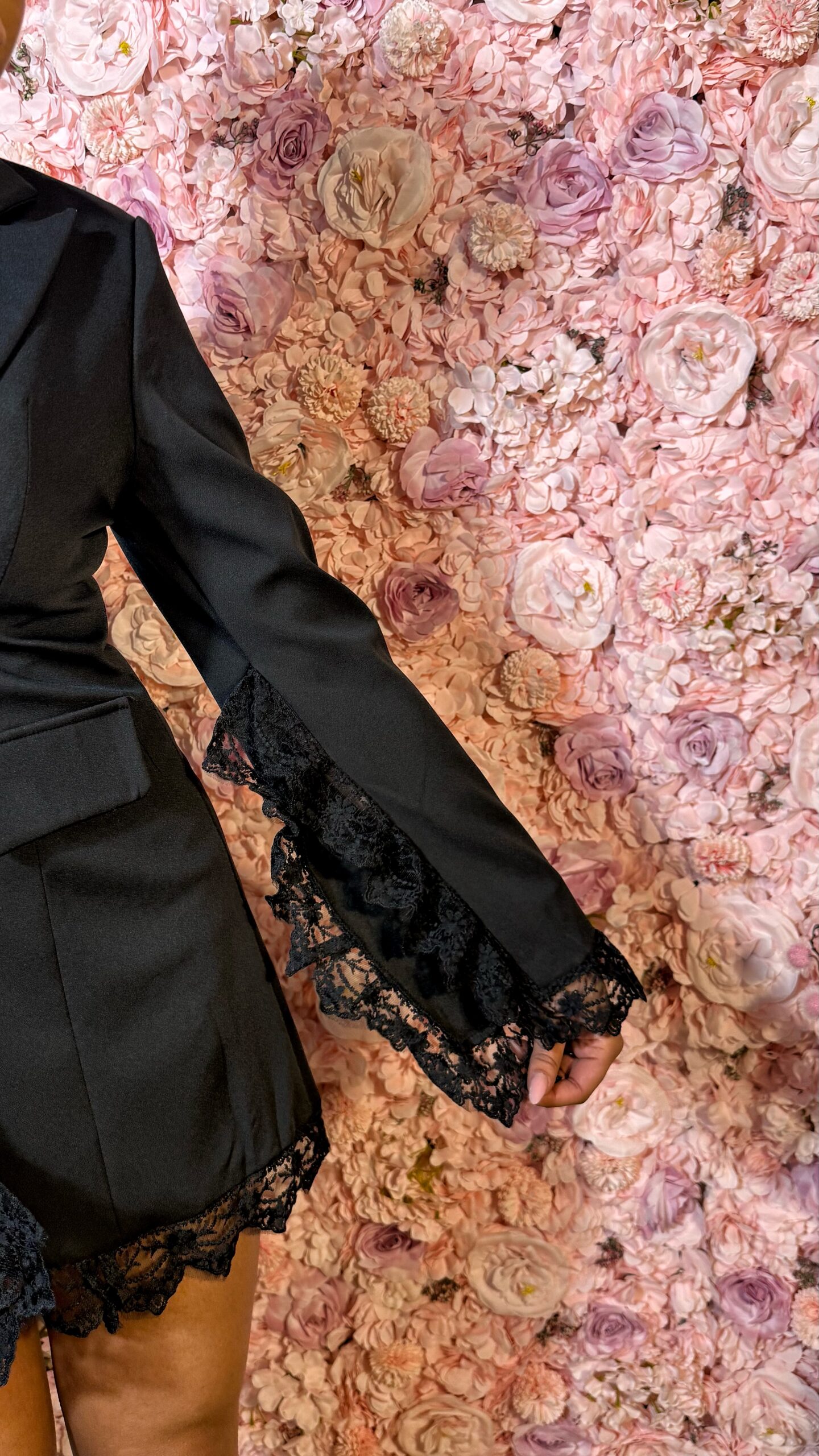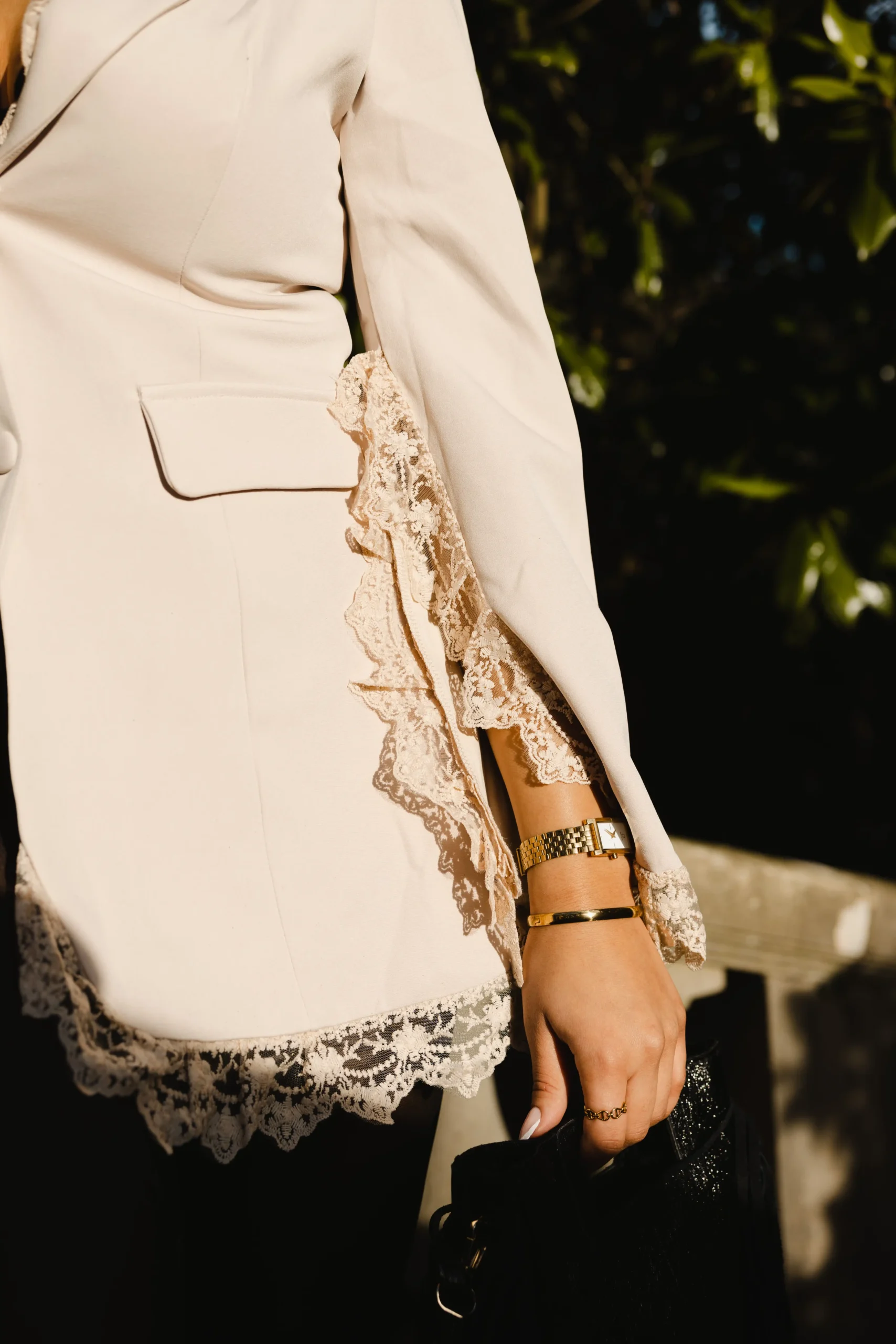 Le col tailleur met en valeur la silhouette tandis que le boutonnage central apporte une allure élégante et intemporelle. Les manches légèrement évasées, sublimées par la dentelle, ajoutent une touche de légèreté et de sensualité maîtrisée.